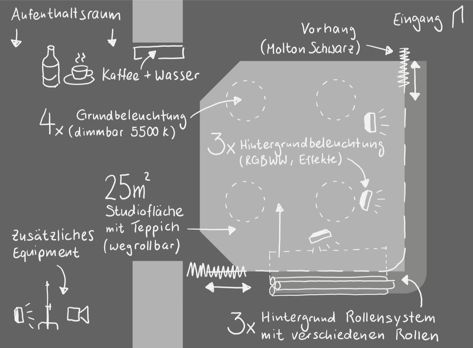 Unser Studio lässt sich verwandeln wie Terminator. Hast du spezifische Fragen zu der Einrichtung oder möchtest du deine Möglichkeiten abchecken? Melde dich bei uns!